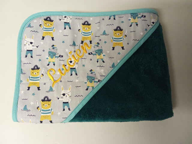 Cape de bain personnalisée en éponge de bambou. 80 par 80cm. Sur commande avec un délai de 15j à 3 semaines. Je vous fais choisir vos tissus selon vos envies. Me contacter pour passer commande